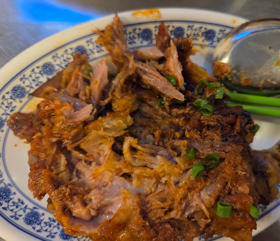 감자탕 고기를 매콤한 닭발 소스를 얹힌맛